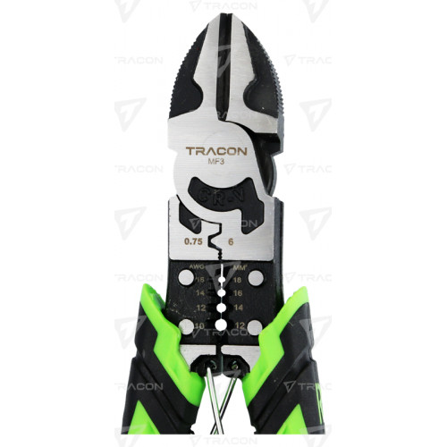 Multifunkčné kliešte MF3 od spoločnosti Tracon ponúkajú štipaciu čelusť a navyše sú vybavené nožom na odizolovanie vodičov až do prierezu 10mm2 a prvok na lisovanie káblových izolovaných a neizolovaných dutiniek ako aj káblových ôk až do prierezu 6mm2.