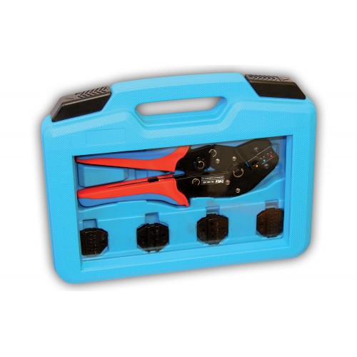 Sada lisovacích kleští s ráčnovým převodem a s výměnnými čelistmi pro pohodlné lisování základních kabelových koncovek a spojek. Inovovaná komfortní dvoukomponentní rukojeť speciálně tvarovaná proti sklouznutí ruky směrem k čelisti.